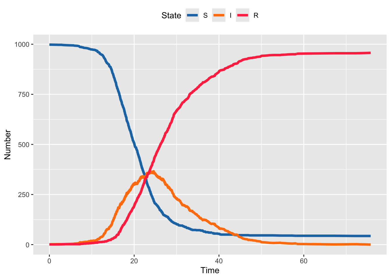 }Note in the code above that we’re taking Poisson random draws, but there is some code commented out that uses binomial draws. The former is exact for the theory, but it can give rise to settings where the transitions “get ahead of themselves” and you have more recoveries than infecteds, or more infections than susceptibles, which drives the states negative. We can fix this by checking if the states go negative and disallowing this … which is inelegant. We can also fix this by using binomial draws, which are naturally constrained not to go negative. The reason we don’t automatically start with binomial draws is that they are computationally slower than Poisson draws (this occurs because the binomial distribution includes some combinatorial terms that are slow to compute). As computers have gotten faster, this is less of an issue.